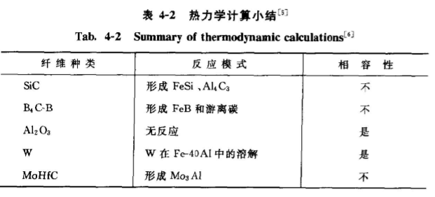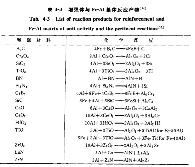 由表4-2可以看出,F(xiàn)eAI與A2O具有較好的適配性能,兩者之間無界面相形成。AAYK. MISRAZ在1990年也分析預(yù)測了以FeAl金屬間化合物為基體,陶瓷為增強體復(fù)合村料的熱動力學(xué)可能反應(yīng)產(chǎn)物),分析結(jié)果見表4-3。上述結(jié)果對復(fù)合材料的設(shè)計也是非常重要的。