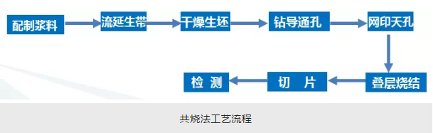 共燒法分為高溫共燒和低溫共燒。兩者工藝流程基本相同,首先將陶瓷粉體與有機粘接劑混合形成漿料,再利用刮刀把漿料加工成片狀,經干燥后形成陶瓷生坯,然后根據設計要求在生坯上加工導通孔并填充金屬粉末,利用絲網印刷技術在生坯表面涂布形成線路圖形,最后將各層生坯層疊后進行壓合,在共燒爐內完成燒結并成型。具體如下: